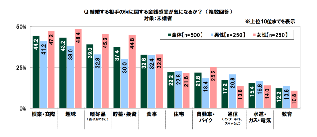 SMBCコンシューマーファイナンスの2025年調査によると、未婚者における結婚する相手に“妥協したくない”ことの第3位に金銭感覚が入っています。