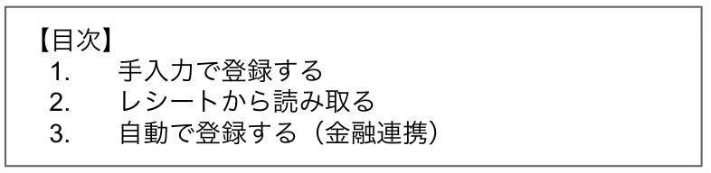 取引明細を登録するには「手入力で登録」「自動登録(口座連携)」の2種類の方法がありますので、順番に見てみましょう。