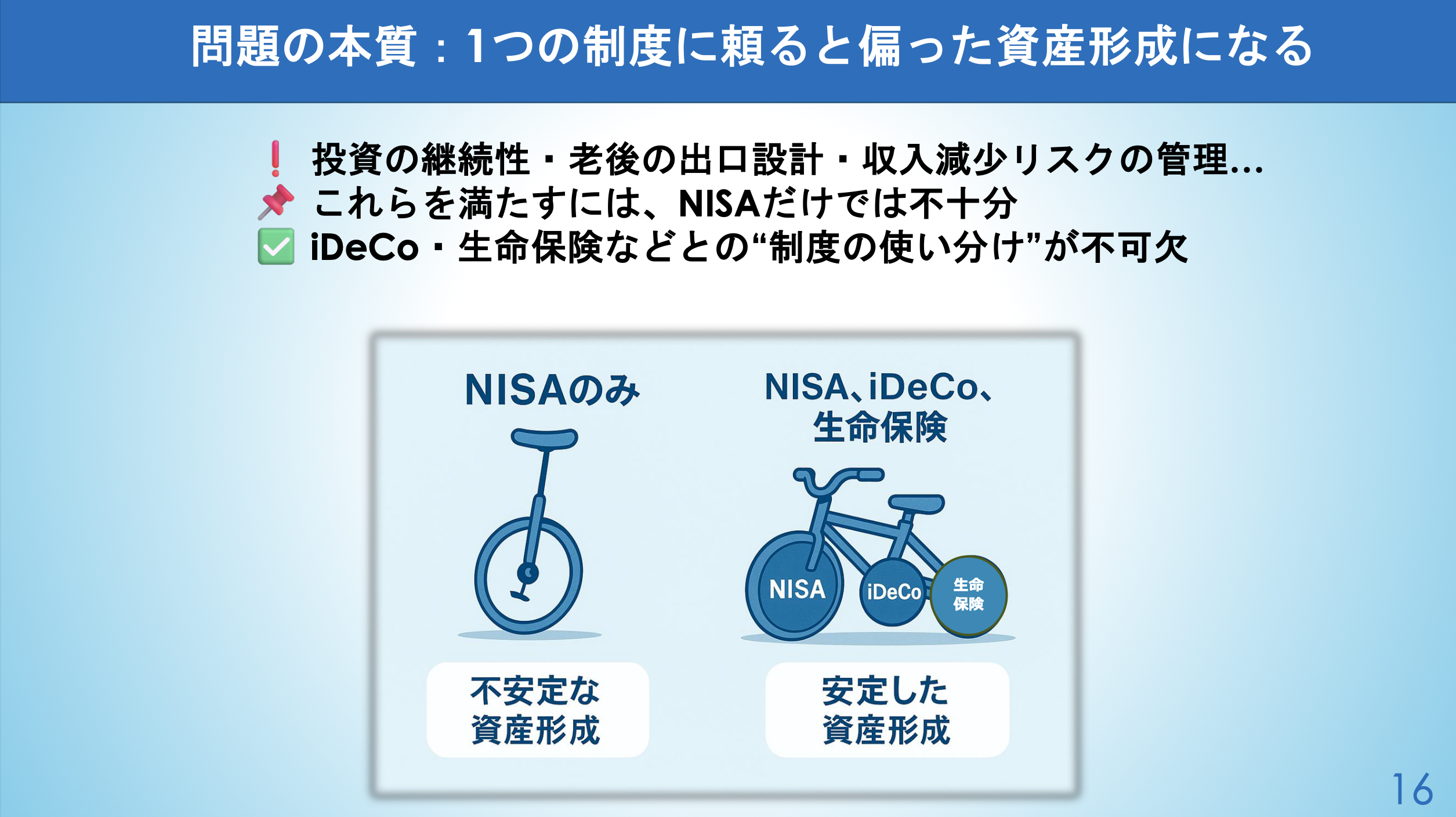 NISA単体か、NISAとiDeCoを組み合わせ、保険をどこまで加えるかについて学びます。