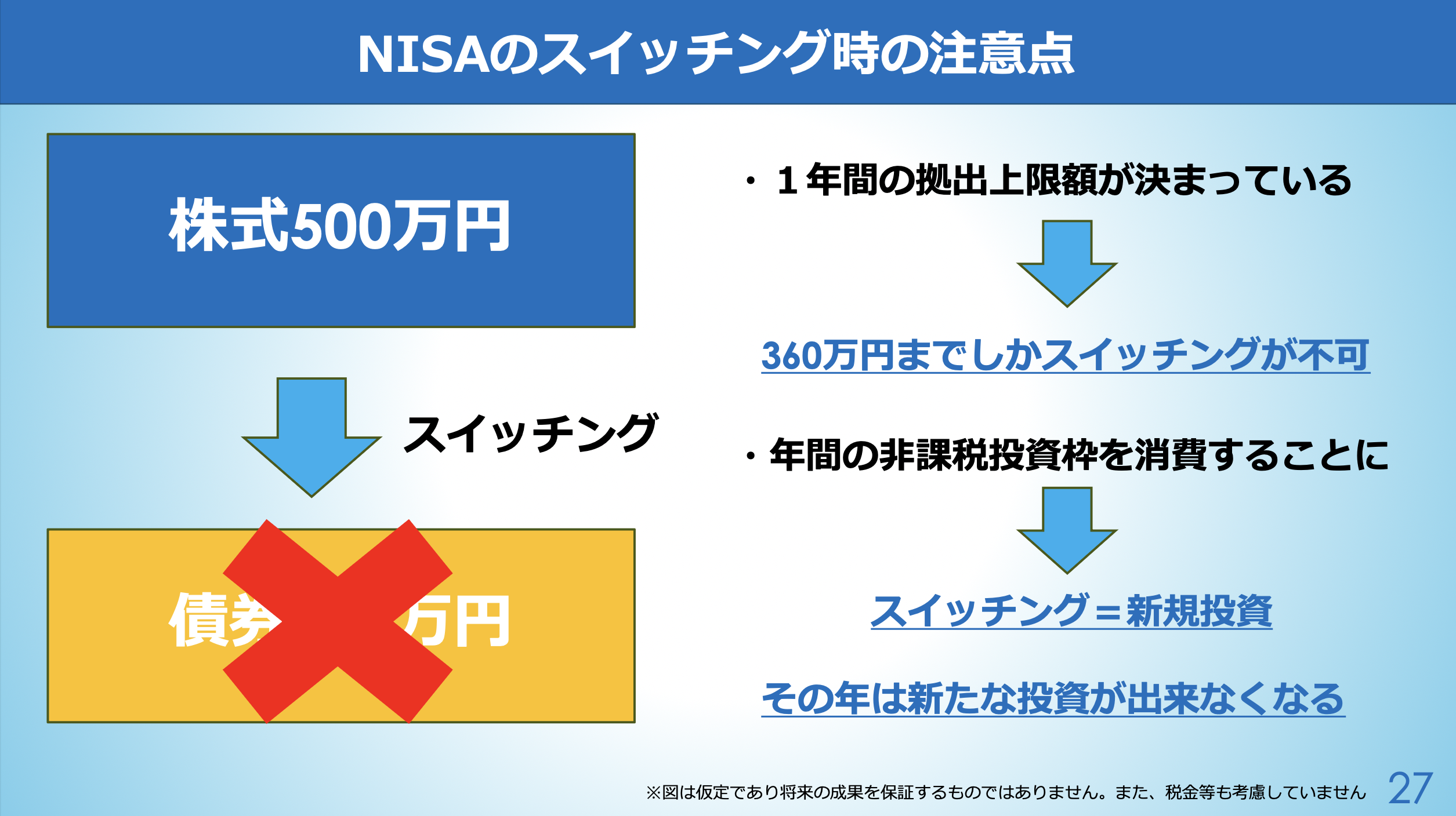 これらをスイッチングといいますが、NISAのスイッチにはどのような問題があるのか、iDeCoだとそれはどうなるのかについて学びましょう。
