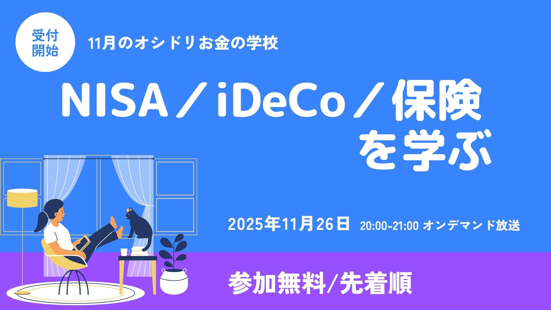 NISA、iDeCo、生命保険の特徴を学び、皆さんの家庭でどのようにバランスを取るかについて学べる1時間になります。